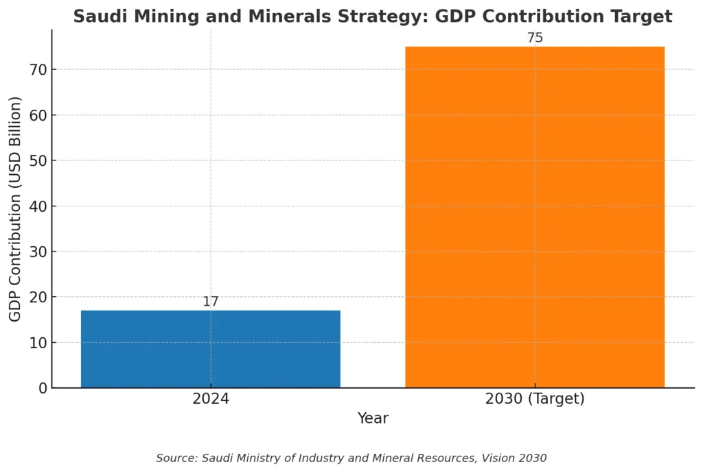 Saudi Arabia is placing mining at the heart of its Vision 2030 plans. The Saudi Mining and Minerals Strategy aims to grow the sector’s GDP contribution to $75 billion by 2030. This is a more than 300% increase from $17 billion in 2024, highlighting the sector’s rising importance in diversifying the national economy.
